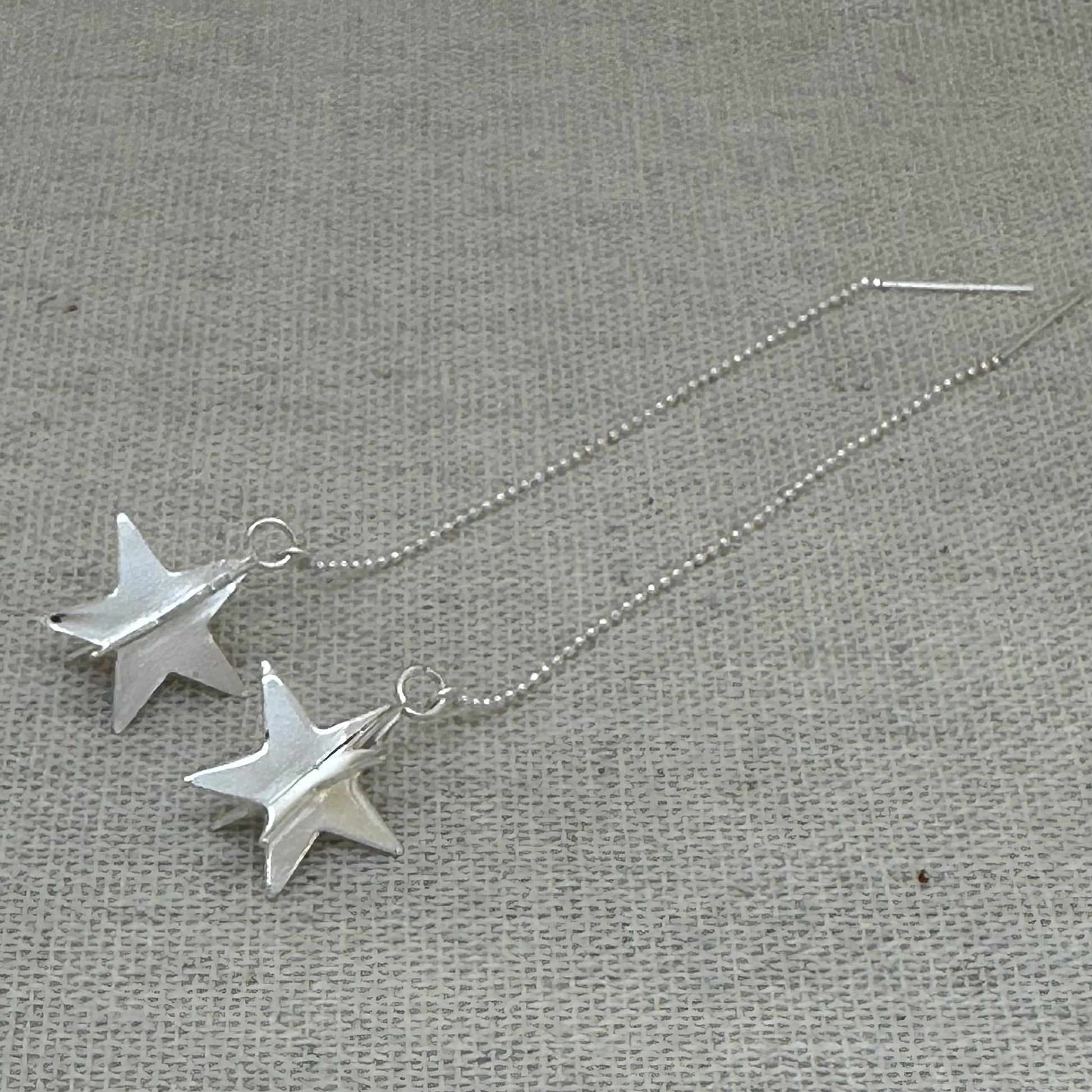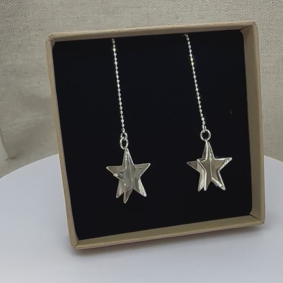 A pair of 3D Star earrings on a Sterling Silver ear threaders, each measures 14mm x 14mm and the threader approx. 8cm long.ย