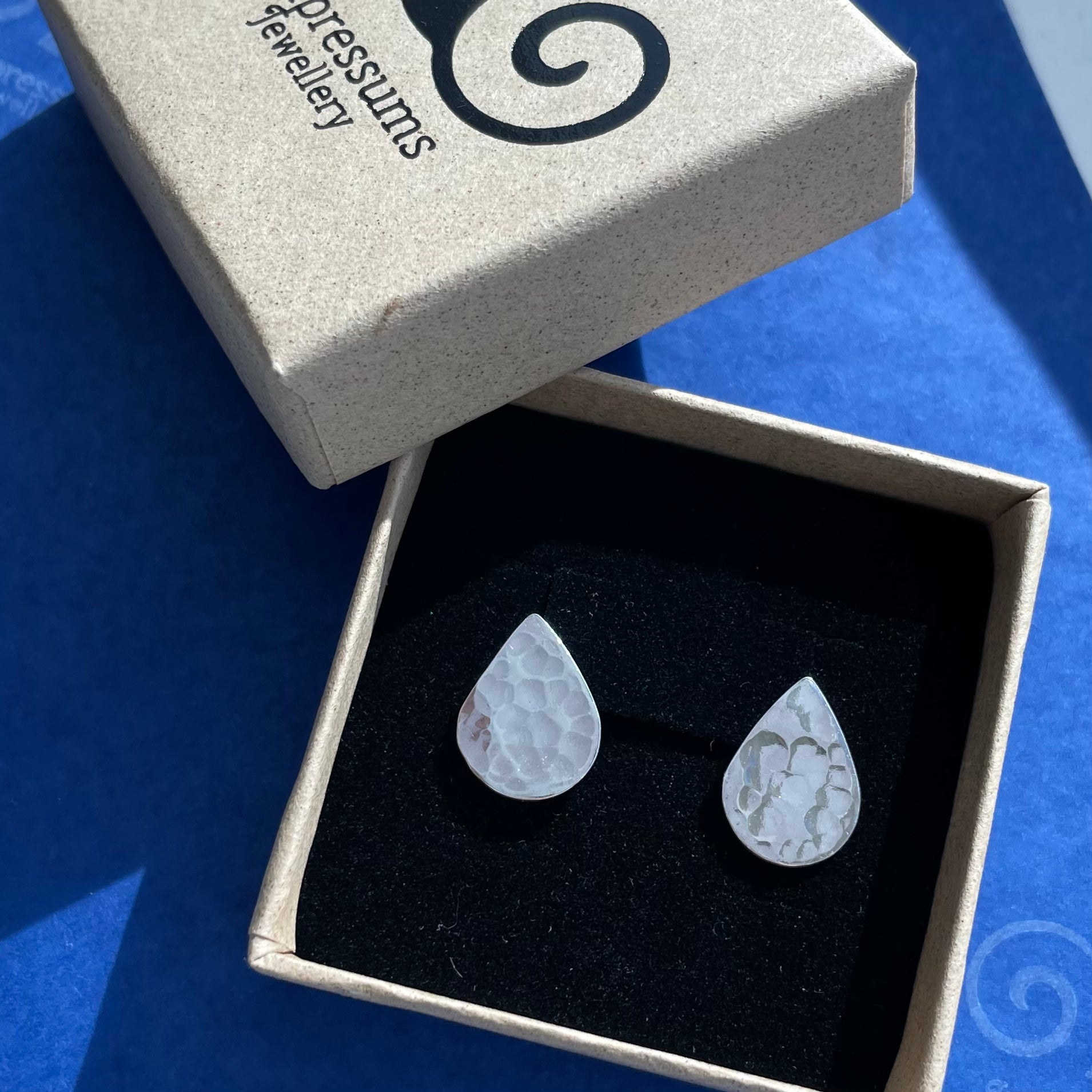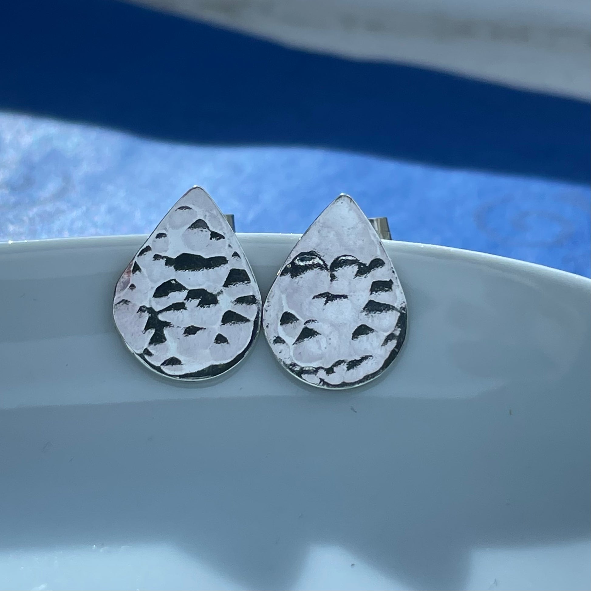 A pair of Sterling Silver Hammered Solid Teardrop Stud Earrings. Each pair is approx. 14mm x 10mm and is shaped and hammered individually therefore no two pairs are the same. The hammering creates a texture that catches the light.